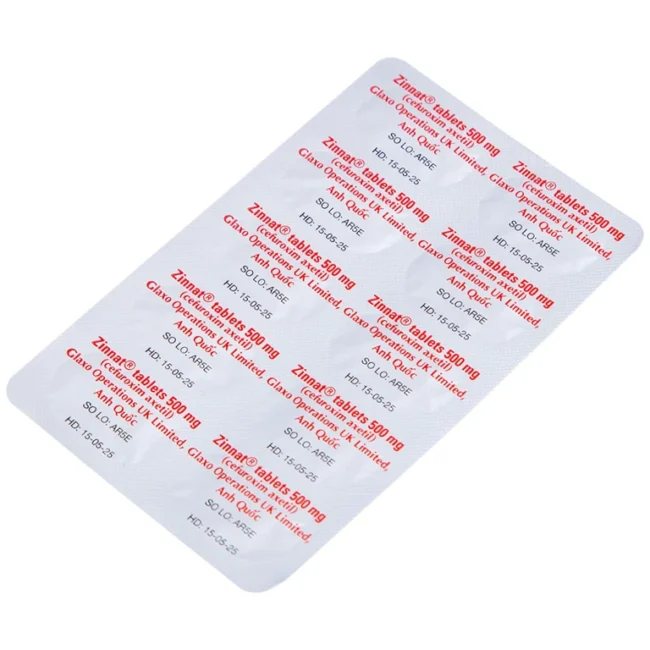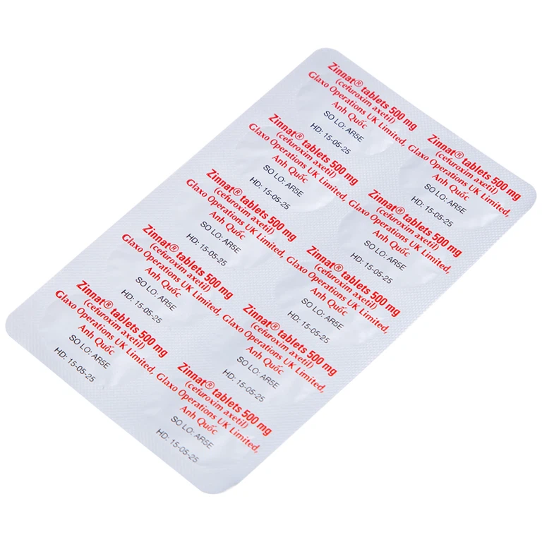 Zinnat Tablets 500Mg có thành phần chính là Cefuroxime có tác dụng điều trị nhiễm khuẩn đường hô hấp trên như nhiễm khuẩn ở tai, mũi, họng ví dụ như viêm tai giữa, viêm xoang, viêm amidan ,viêm họng. Nhiễm khuẩn đường hô hấp dưới như viêm phổi và viêm phế quản cấp. Nhiễm khuẩn niệu-sinh dục như viêm bể thận, viêm bàng quang, viêm niệu đạo. Nhiễm khuẩn da và mô mềm như bệnh nhọt, mủ da, chốc lở. Bệnh lậu, như viêm bể thận và viêm cổ tử cung cấp không biến chứng do lậu cầu.